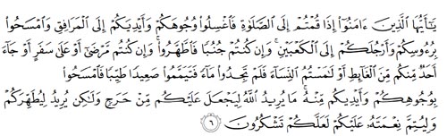 “O you who have believed, when you rise to [perform] prayer, wash your faces and your forearms to the elbows and wipe over your heads and wash your feet to the ankles. And if you are in a state of janabah, then purify yourselves. But if you are ill or on a journey or one of you comes from the place of relieving himself or you have contacted women and do not find water, then seek clean earth and wipe over your faces and hands with it. Allah does not intend to make difficulty for you, but He intends to purify you and complete His favor upon you that you may be grateful.” Surah Al-Maeda (5:6)